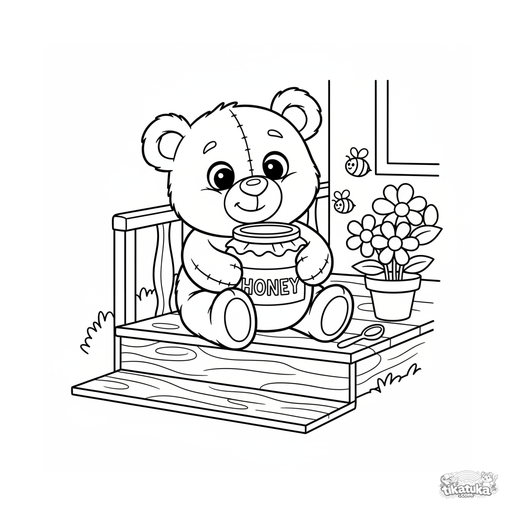Simple coloring page for toddlers 2-3: a big plush teddy bear sits on a veranda step with a jar of honey. Large shapes, low detail, cozy.