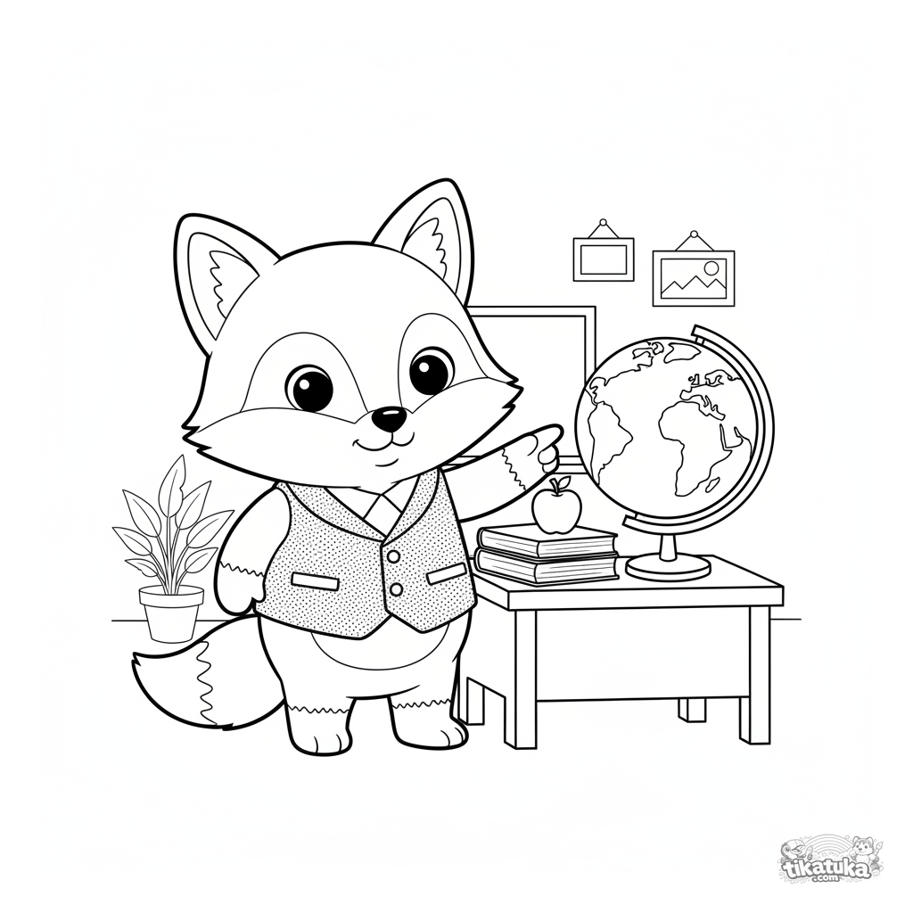 Coloring page for kids 4-6: a fox teacher in a classroom with a globe and textbooks. A friendly scene to color.