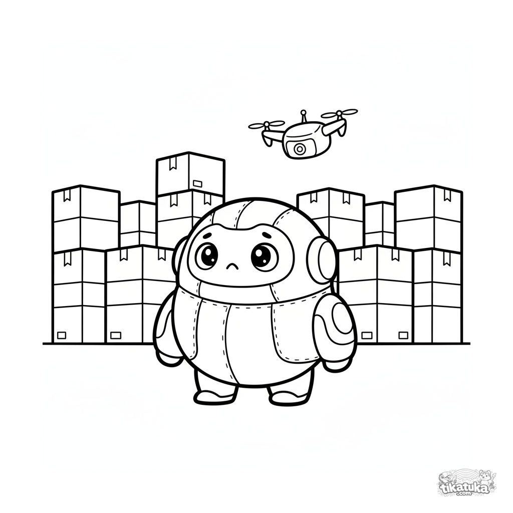 Simple coloring page for the youngest: a cute plush robot looks confused among boxes in a warehouse. Large, soft shapes, perfect for toddlers 2-3 years old.