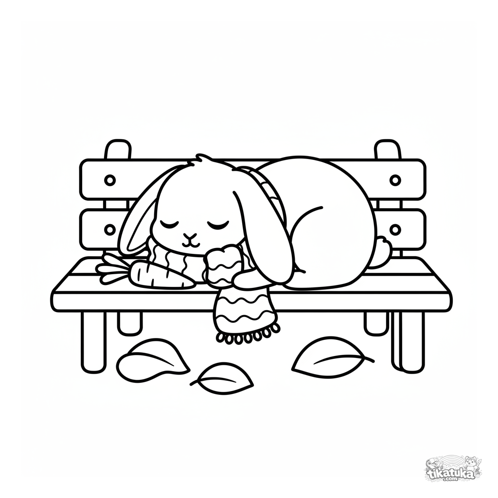 Simple coloring page for toddlers 2-3: a cute plush rabbit naps on a park bench. Large shapes, few details, wide margins for coloring.