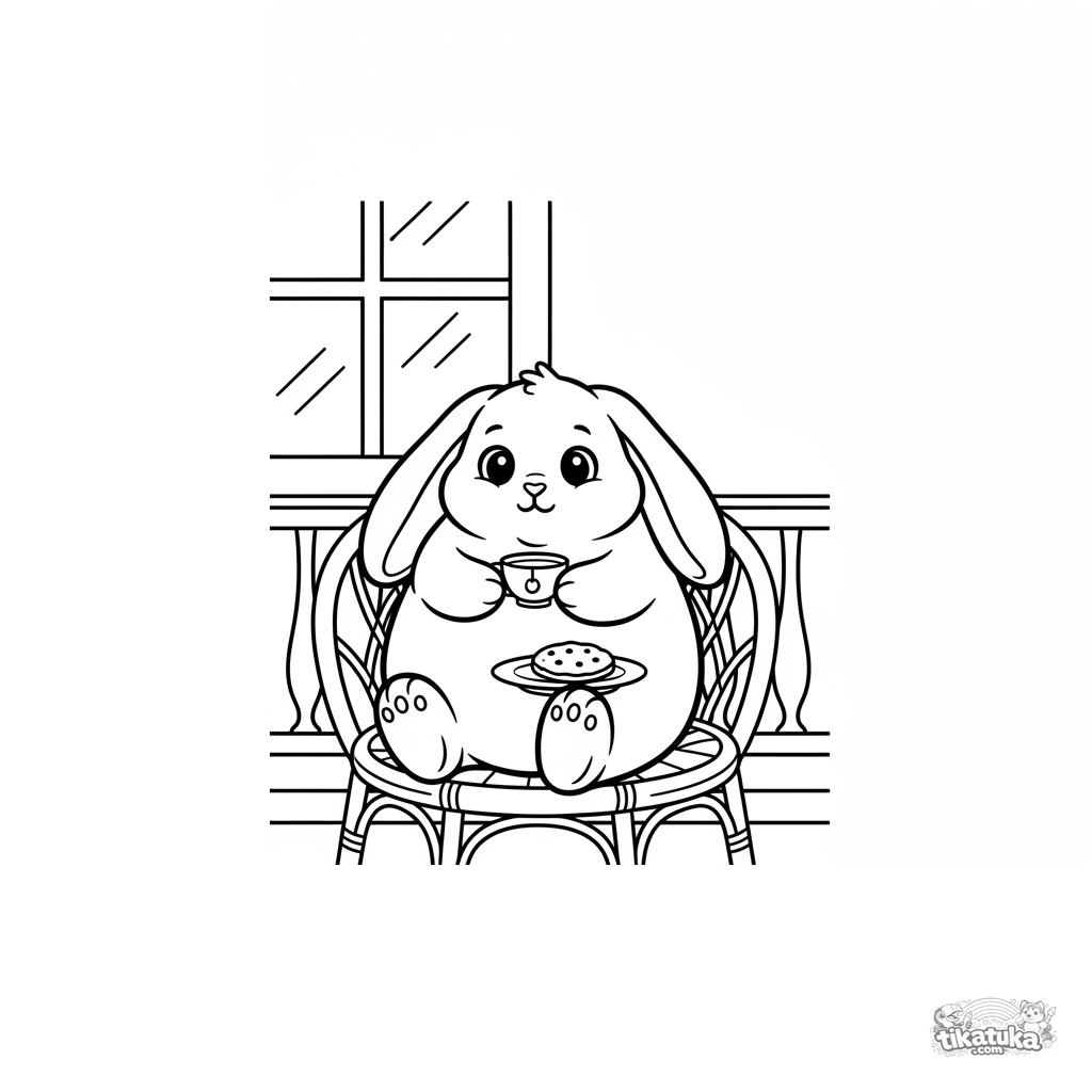 Toddler coloring page: a plush rabbit holding a teacup on a summer veranda. Simple large shapes with wide margins for coloring.