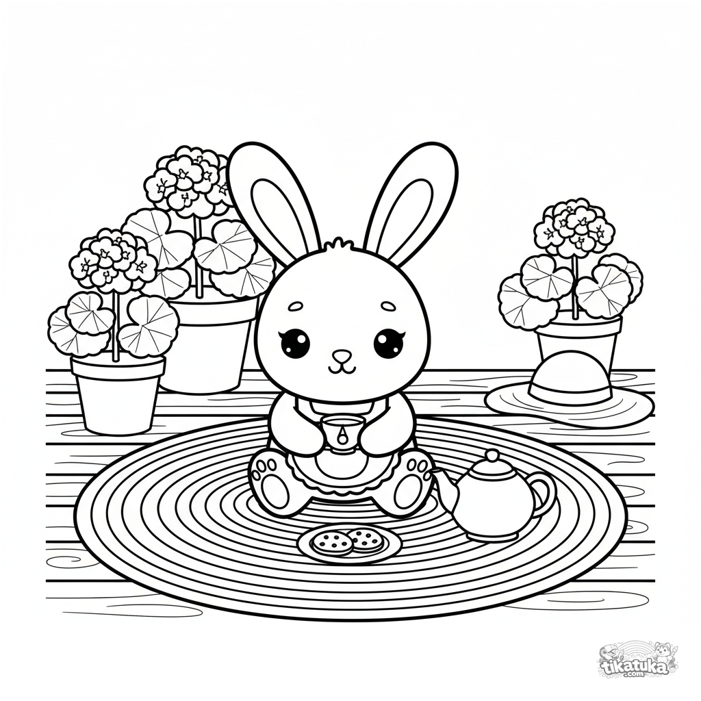 Toddler coloring page: a plush rabbit enjoys tea on a cozy summer veranda. Simple large shapes with wide margins for coloring.