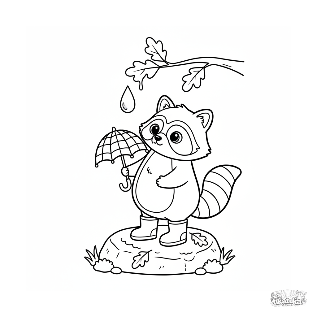 Coloring page for toddlers 2-3: a plush raccoon in boots holds a tiny umbrella under a dripping branch in an autumn forest.