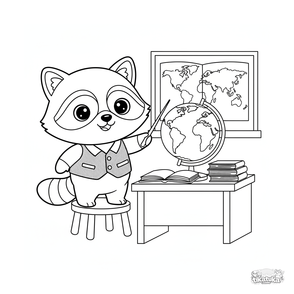 Coloring page of a raccoon teacher by a blackboard with a globe for kids 4-6. Cute character in a vest explains geography, with map and books drawn.