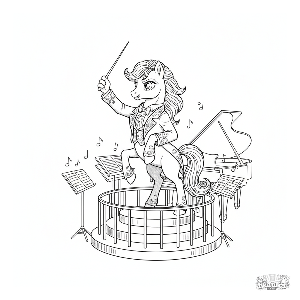 Detailed vintage engraving style coloring page of a pony conductor in a theater orchestra pit. For kids 10-12 years old. Scene with podium, sheet music, and piano.