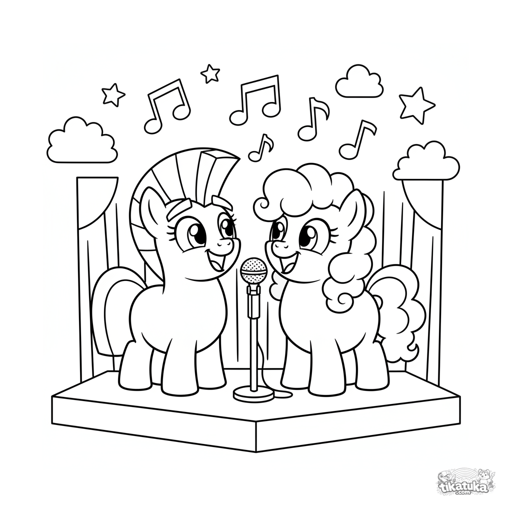 Coloring page for kids 4-6: two cheerful ponies sing a duet into a microphone on stage. Fun scene with musical notes.