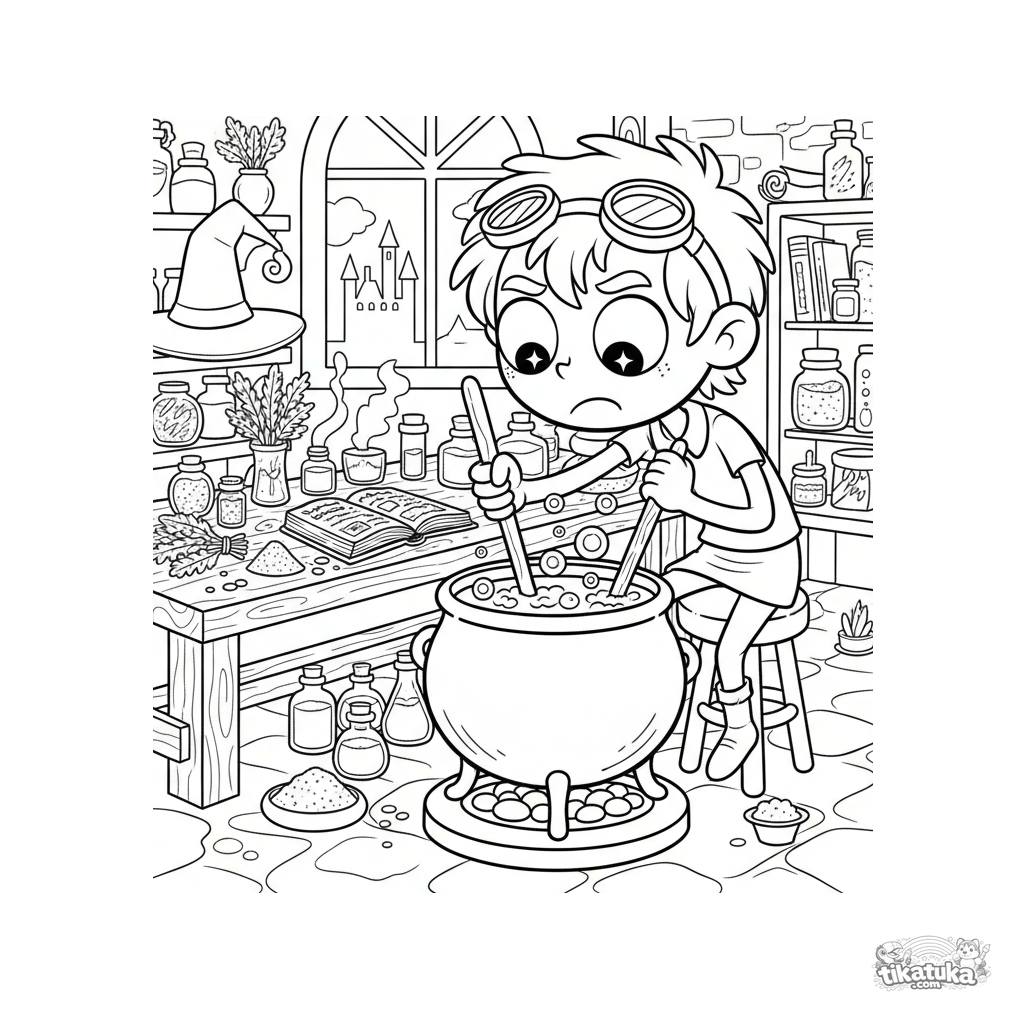 Coloring page for kids 4-6: a young potion apprentice with big goggles carefully stirring a bubbling cauldron in a cluttered wizard's workshop.