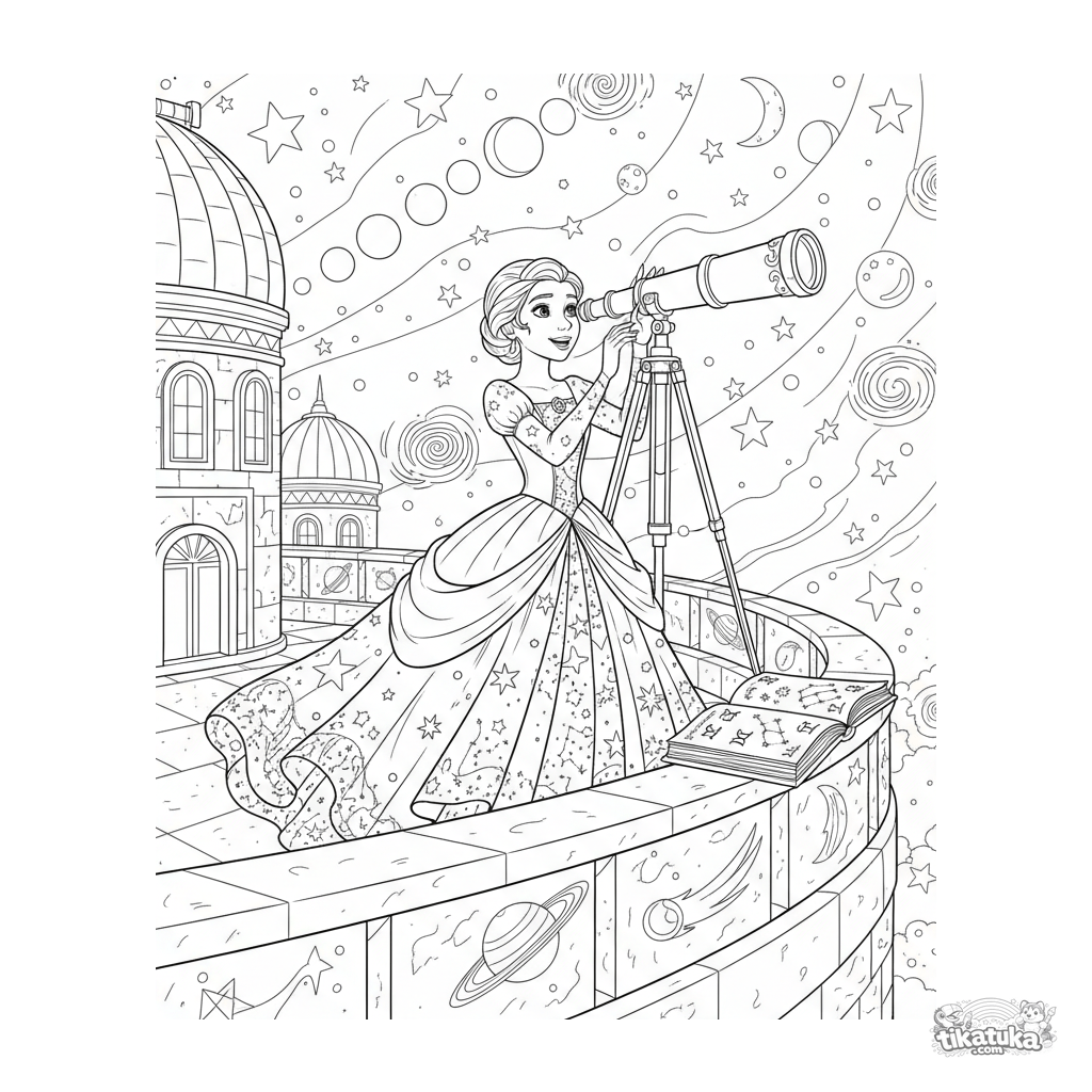 Detailed coloring page for ages 7-12: a princess in a starry gown uses a telescope on an observatory balcony. Intricate scene with a constellation book.