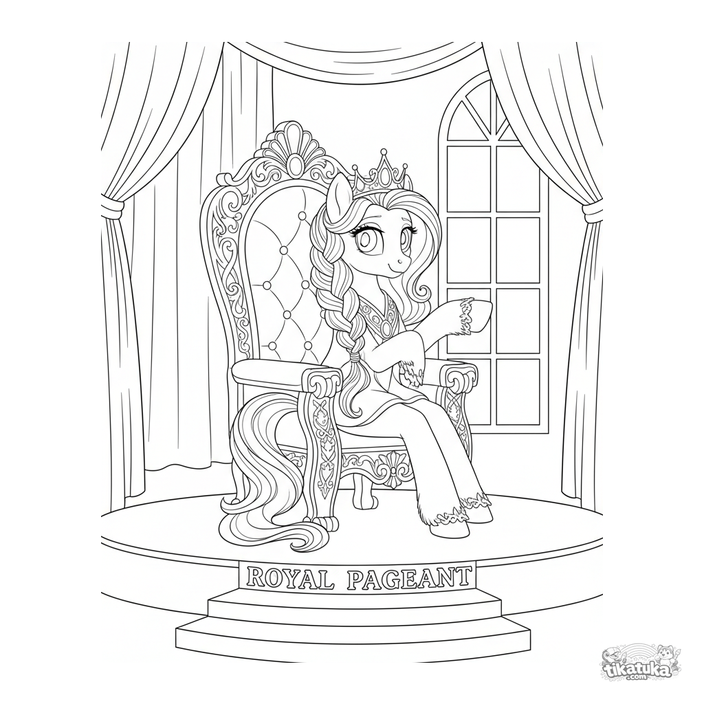 Detailed coloring page for older kids 10-12: a realistic princess pony in a crown addresses an audience from a throne on stage. Intricate linework of jewels, robes, and set decor.