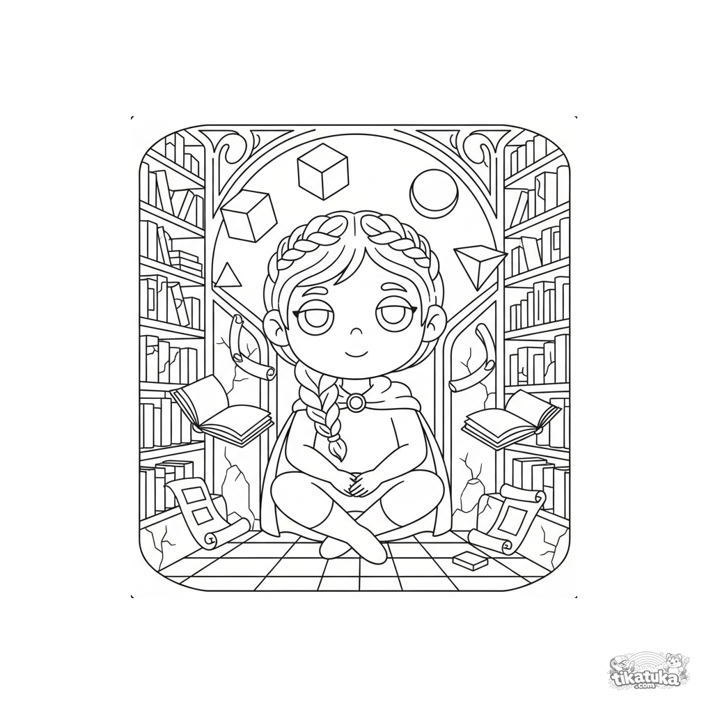 Coloring page for tweens 7-9: a psychic hero floats in an ancient ruined library, with geometric shapes and scrolls orbiting around them.
