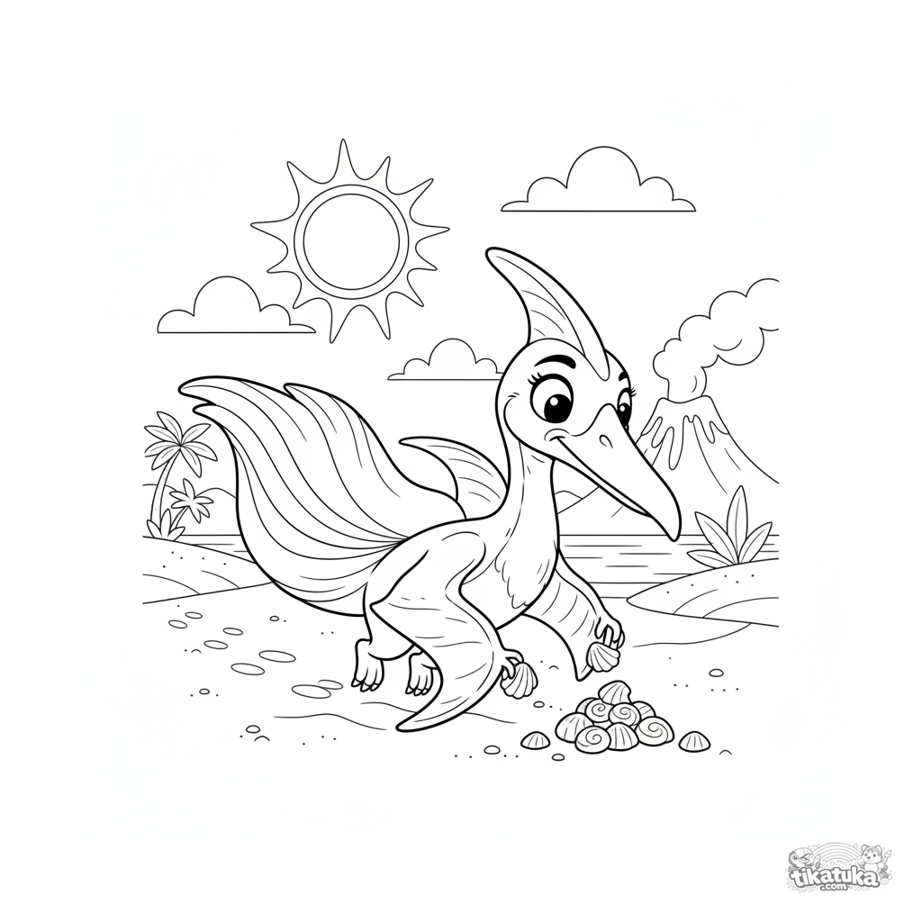 Coloring page for kids 7-9: a pteranodon collecting shiny shells on the sandy beach of an ancient ocean. A dynamic and interesting scene.
