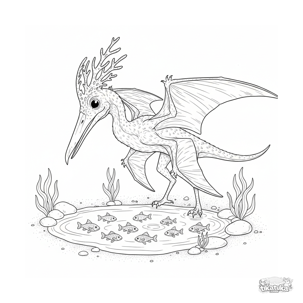 Detailed coloring page for ages 10-12: a pterosaur hunts for fish in shallow tide pools on the sandy shore of an ancient ocean. Scientific illustration style.