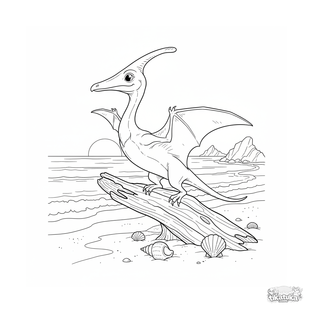 Coloring page for tweens 7-9 years: a pterosaur perches on driftwood on an ancient ocean sandy beach, observing the water. Moderate detail, natural proportions.