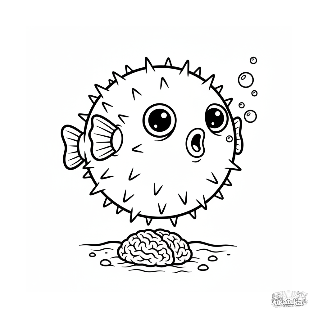 Funny coloring page for ages 4-6: a surprised pufferfish inflated near coral in sunny shallow water. Wacky 90s cartoon style with expressive emotion.