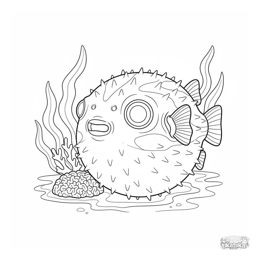 Detailed coloring page of a pufferfish inflating near a coral outcrop in sunlit shallow water. For older kids 10-12. Realistic style with textures.
