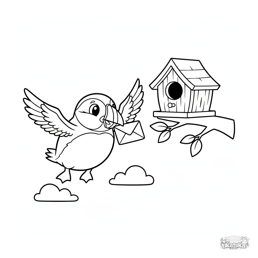 Coloring page for kids 4-6 in an 80s cartoon style: a cheerful puffin flies to a birdhouse to deliver a letter. A bright, dynamic scene avoiding the fish cliché.