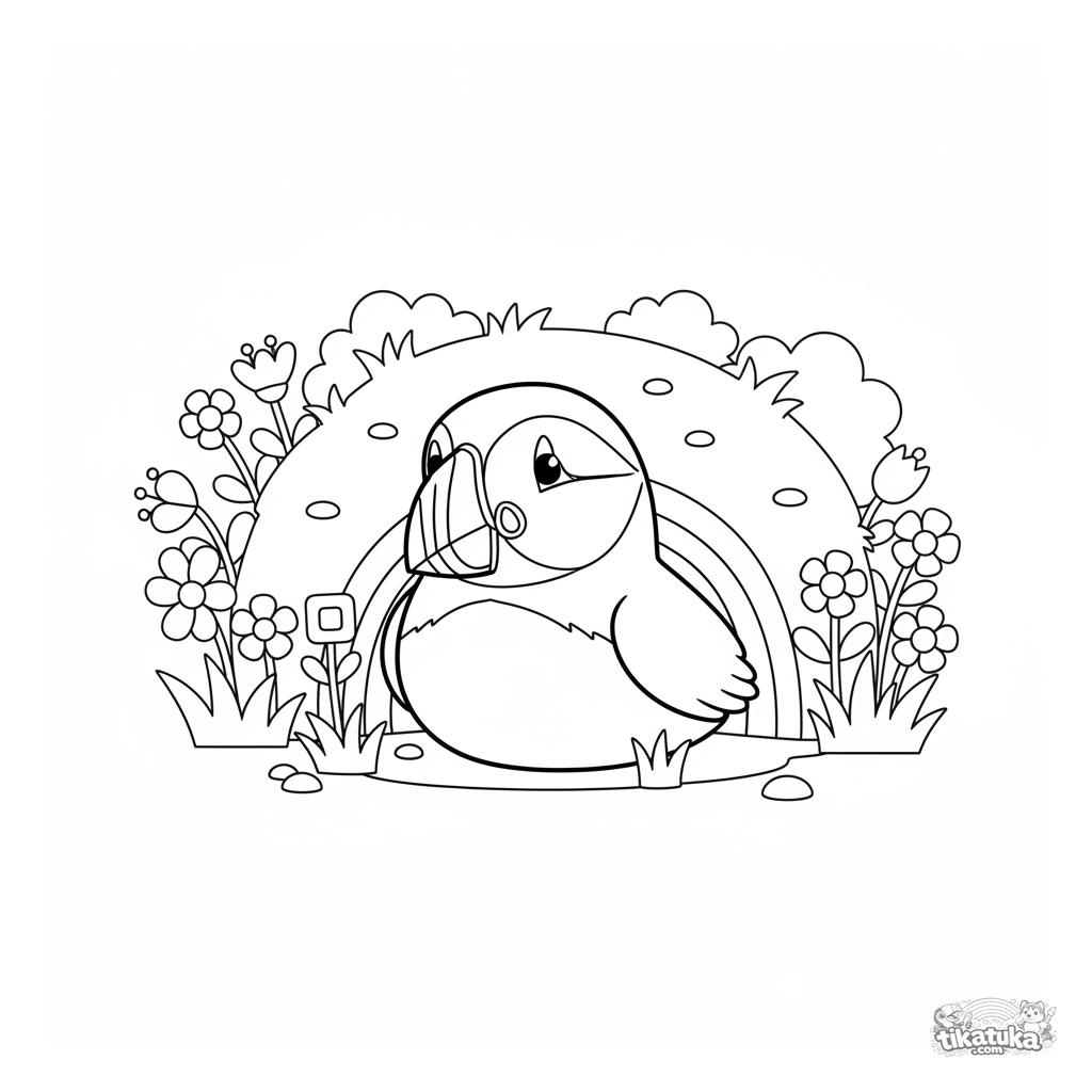 Kids coloring page: a puffin peeking from its grassy burrow in a flower meadow. For ages 4-6, a cute and simple scene.