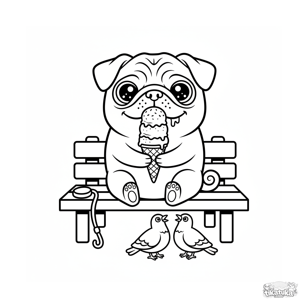 Toddler coloring page 2-3 years: a funny pug with an ice cream sits on a bench. Very simple, large shapes, chibi style, few details.