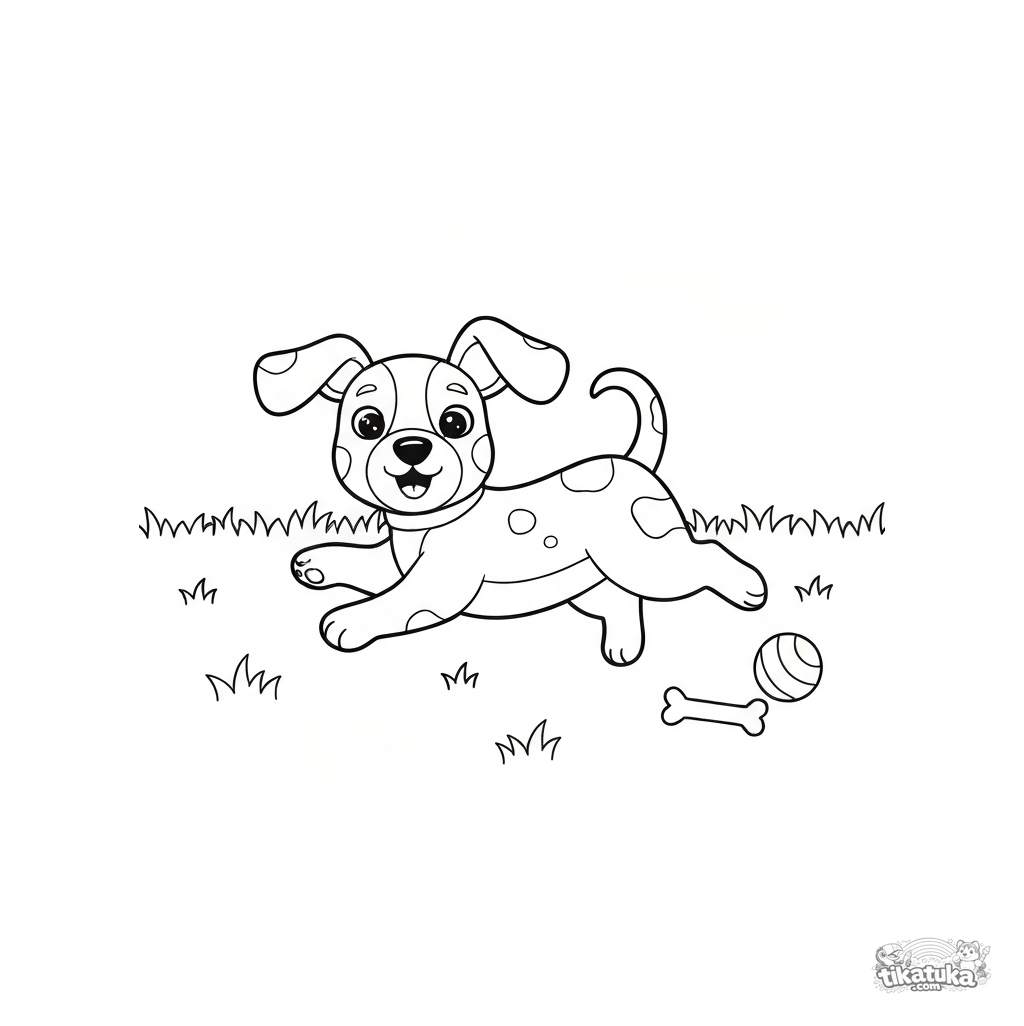 Coloring page for toddlers: a happy puppy chases its tail in a yard. Simple lines and shapes, for kids aged 2-4.