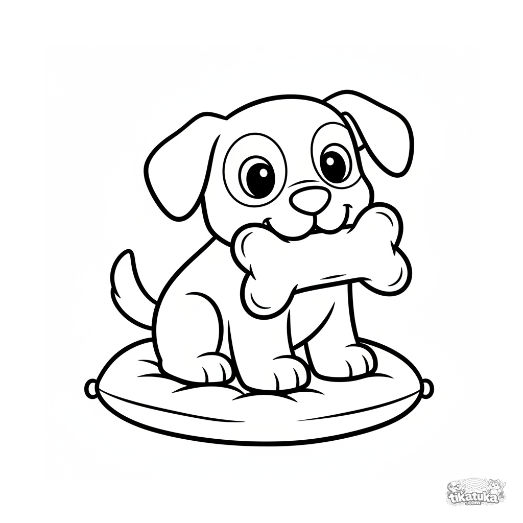 Coloring page for the youngest (2-3 years): a happy puppy with a wooden-toy shape sits on a cushion holding a bone pillow. Simple geometric shapes.