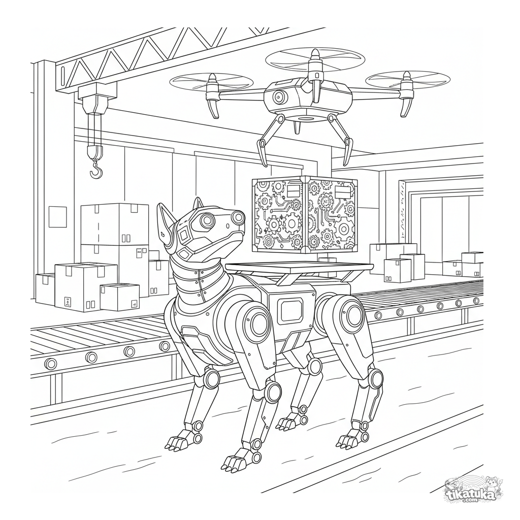 Detailed coloring page for kids 10-12: a realistic dog-like loader robot in a warehouse. Anatomy of a mechanical quadruped, loading scene with a drone.