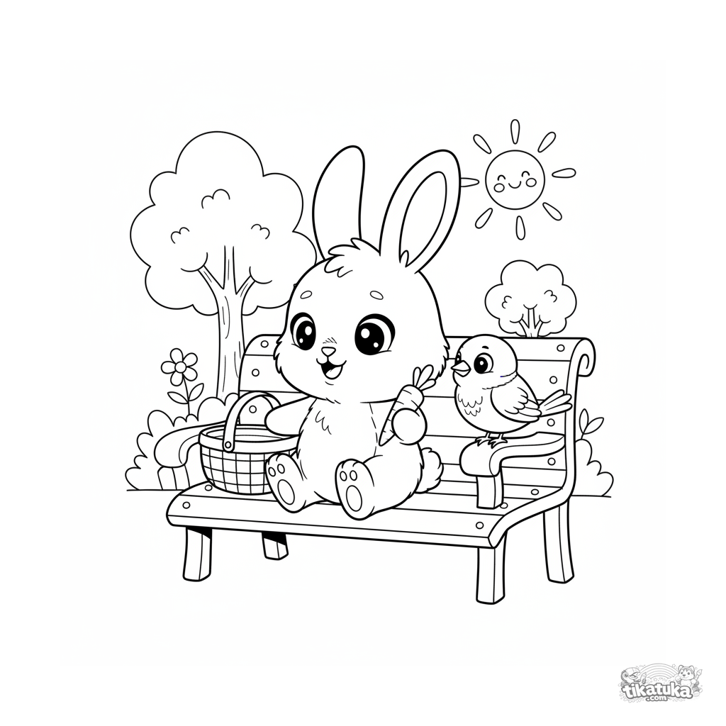 Coloring page for kids 7-9: a cute rabbit shares a carrot stick with a sparrow on a park bench. A warm scene about friendship and generosity.