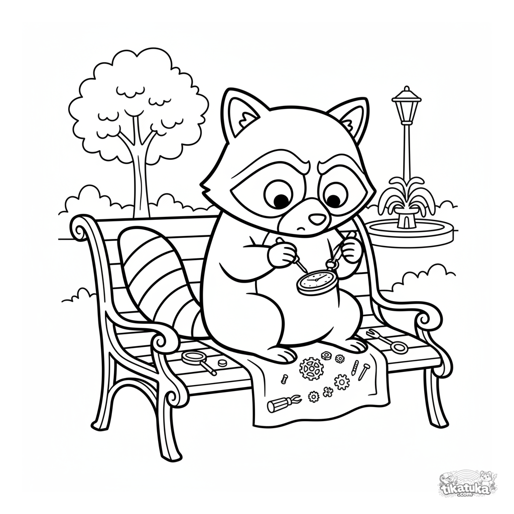 Coloring page for kids 7-9: a tinkering raccoon fixes a pocket watch while sitting on a park bench. 90s Nickelodeon style with fun details.