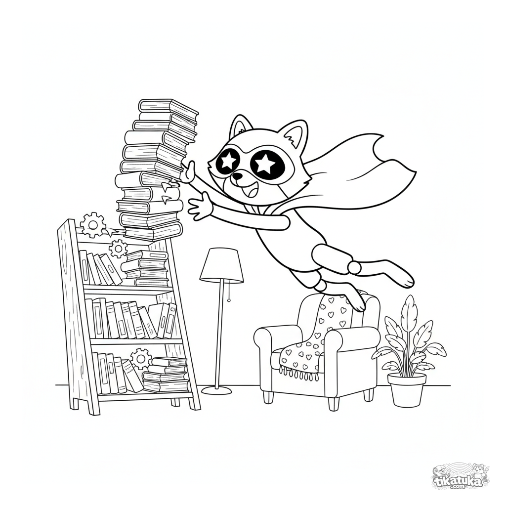 Coloring page for kids 4-6: raccoon Shmyak as a superhero catching falling books in a library. Dynamic pose, geometric wooden-toy style.