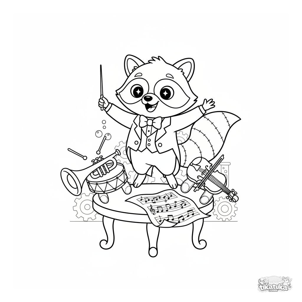 Coloring page featuring conductor raccoon Shmyak leading a toy orchestra. For kids 4-8, introduces the world of music.