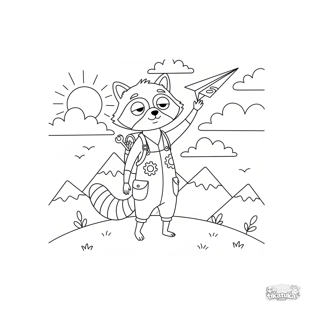 Coloring page for kids 4-6: raccoon Shmyak launching a paper airplane over mountains. Elongated puppet proportions, soft lines, no complex details.