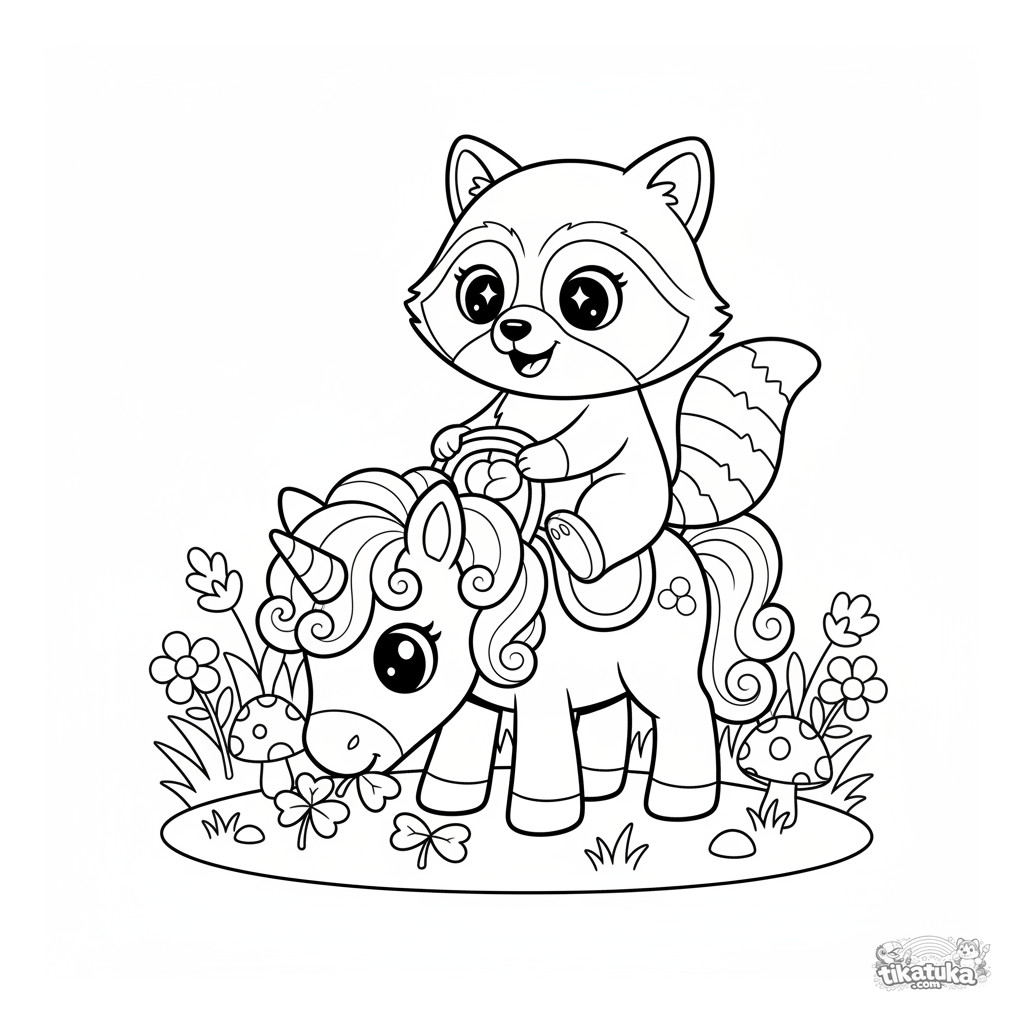 Coloring page for girls 4-6: Raccoon Shmyak rides a kind, magical pony with a curly mane in a flowering meadow. A sweet and simple scene.