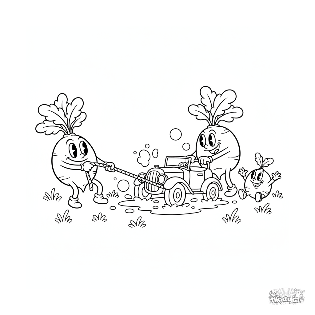 Coloring page for tweens 7-9: a funny family of radishes rescues a tiny car from mud in the garden. Playful retro cartoon style.