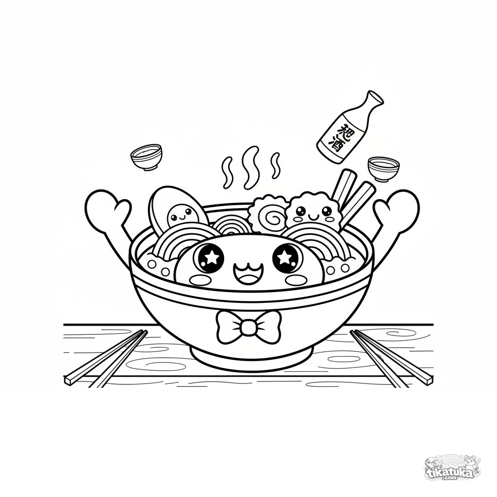 Kids coloring page: a happy ramen bowl with waving noodles celebrates on a restaurant counter. A bright scene with egg and fish cake for children ages 4-6.