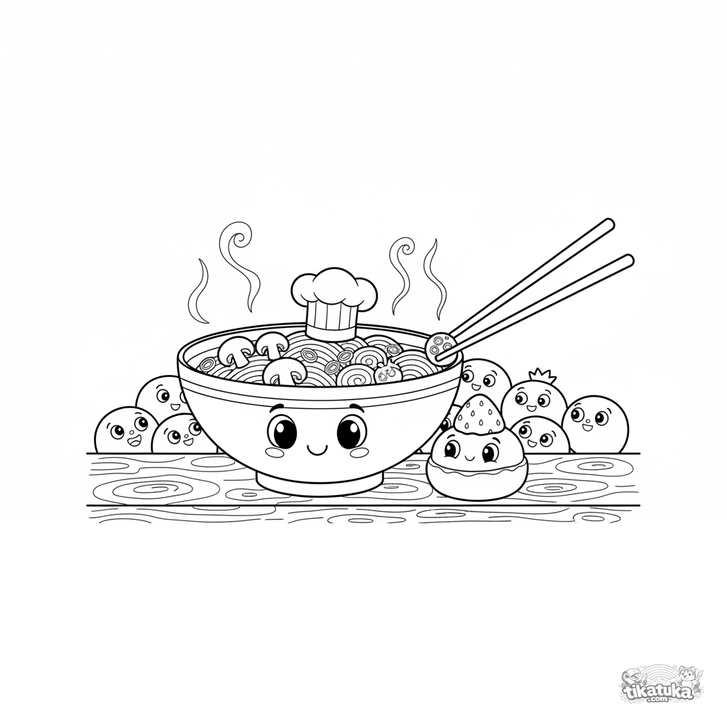 Coloring page for tweens 7-9: a ramen bowl in a chef's hat serves strawberry mochi. A kitchen counter scene with details.