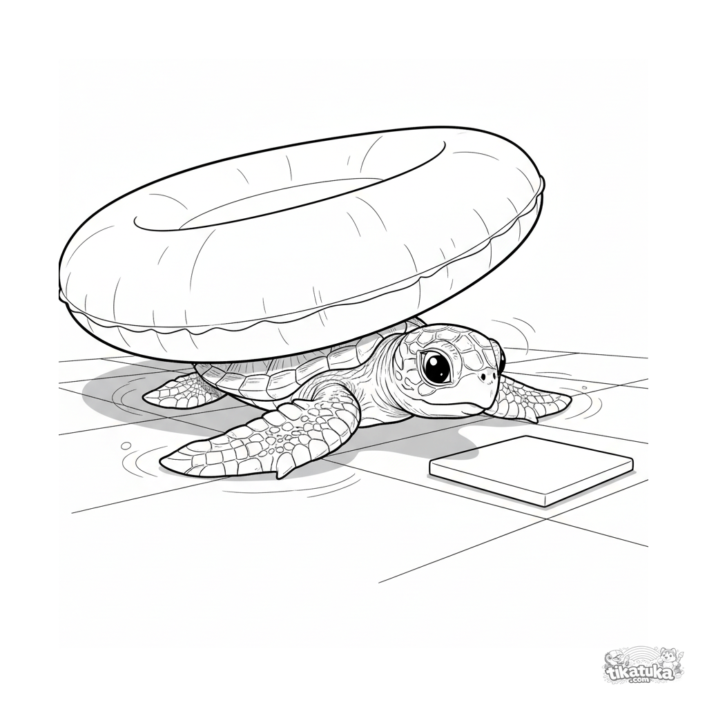 Detailed coloring page for kids 10-12: a realistic baby turtle explores the space under an inflatable ring on the pool bottom.
