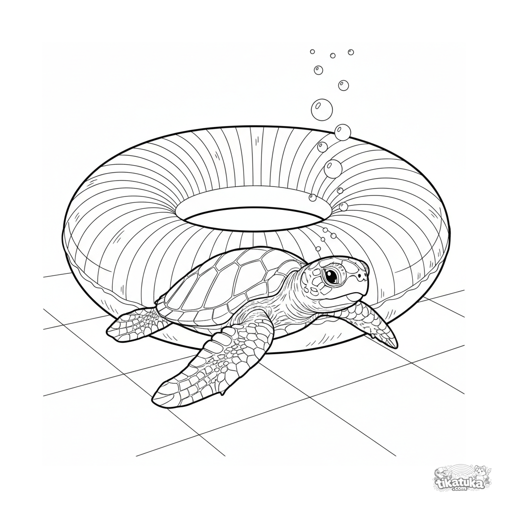 Detailed coloring page for kids 10-12 years: a baby turtle swims under an inflatable ring at the pool bottom. Realistic outlines, anatomical details.