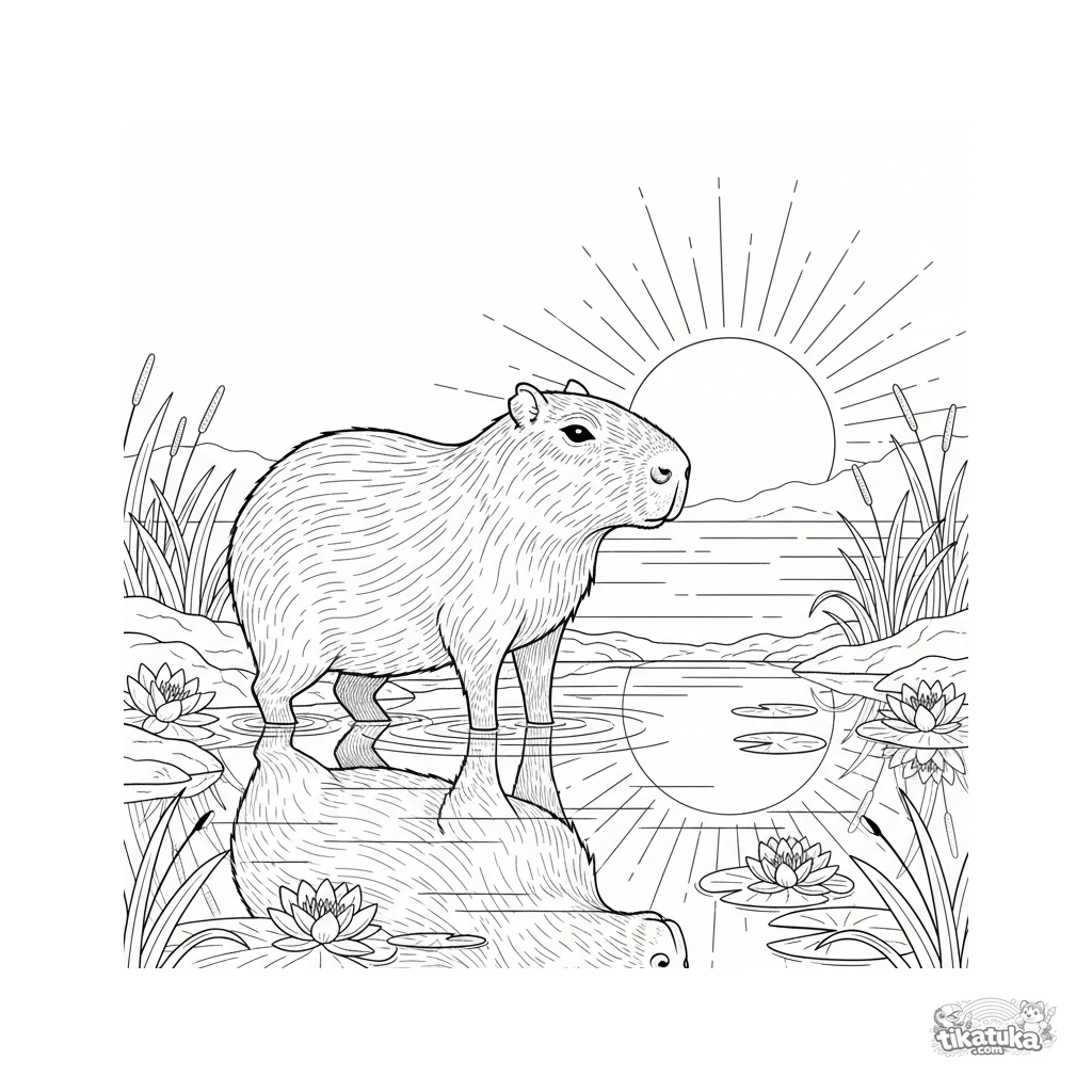Detailed coloring page for kids 10-12: a realistic capybara watches the sunset by a pond, its reflection in the water. Intricate linework of fur, plants, and water.