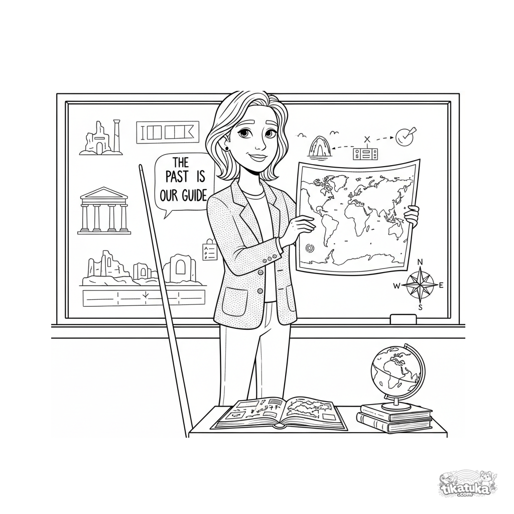 Coloring page for older kids 10-12: a history teacher in a jacket displays an old map by the blackboard in a school classroom, detailed realistic scene.