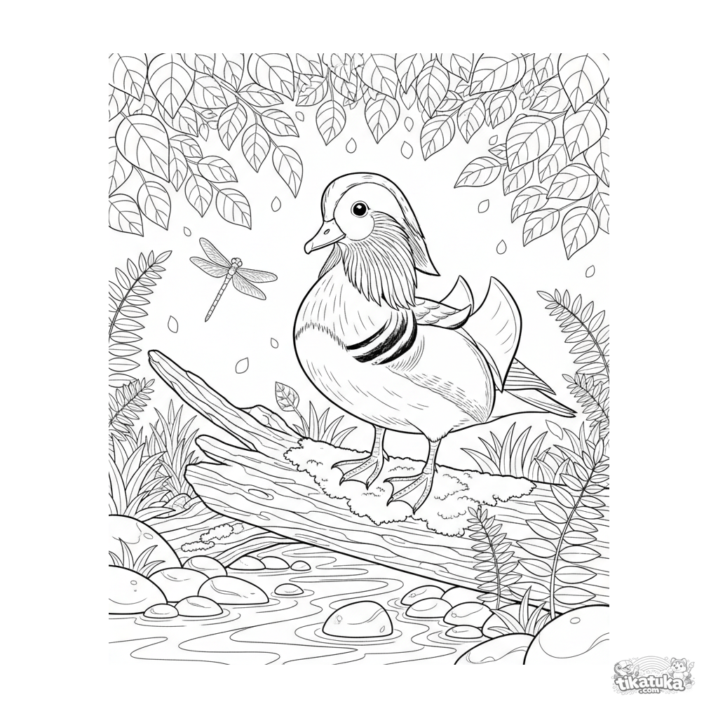 Detailed coloring page of a mandarin duck standing on a mossy log by a forest stream. For older kids 7-12. Features the bird's intricate plumage, a dragonfly, and ferns.