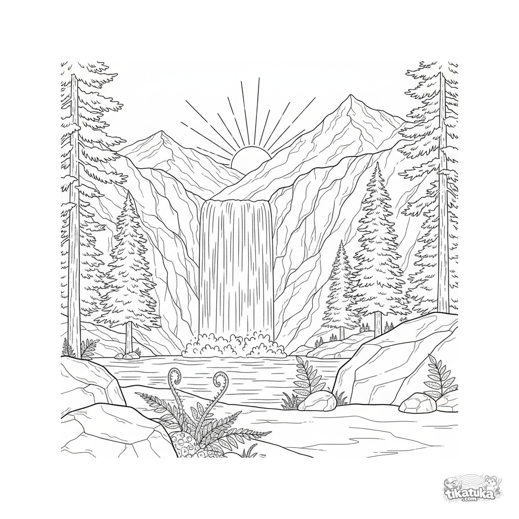Coloring page of a realistic mountain landscape with a waterfall and pine trees. For older kids 7-12. Detailed scene with sunset and rocks.