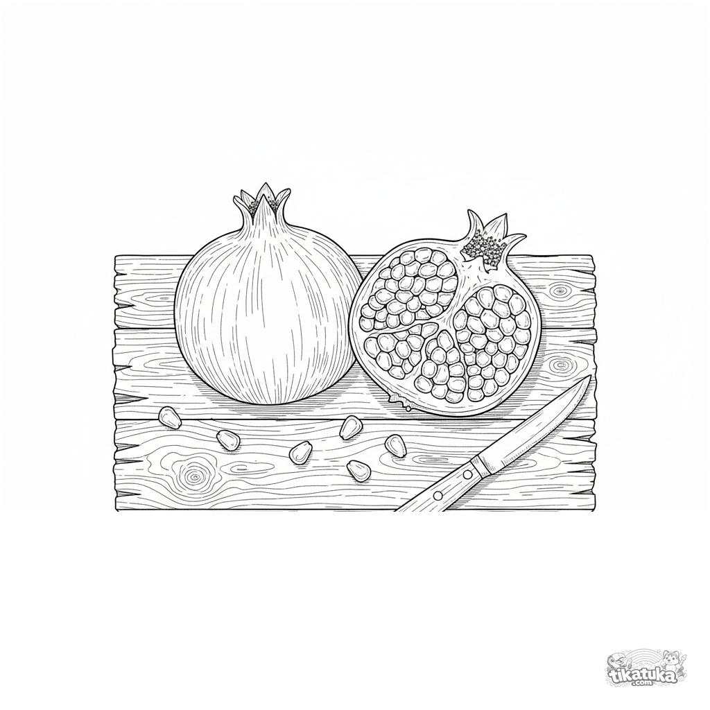 Detailed realistic coloring page of pomegranate halves. For older kids 10-12 years. Shows whole fruit, cross-section with seeds, a knife, and scattered seeds on wood.