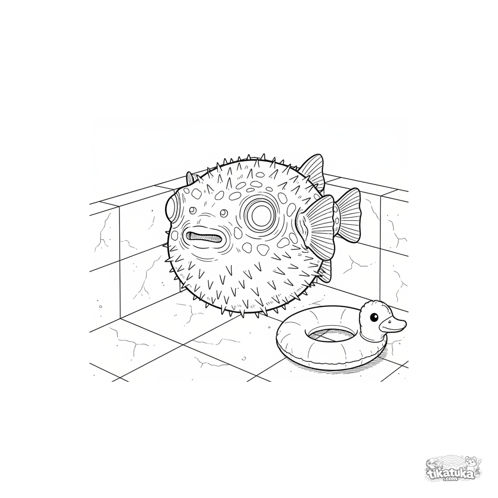 Intricate coloring page of a realistic pufferfish in a pool corner. For older kids 10-12 years old. Detailed spines, texture, and environment.