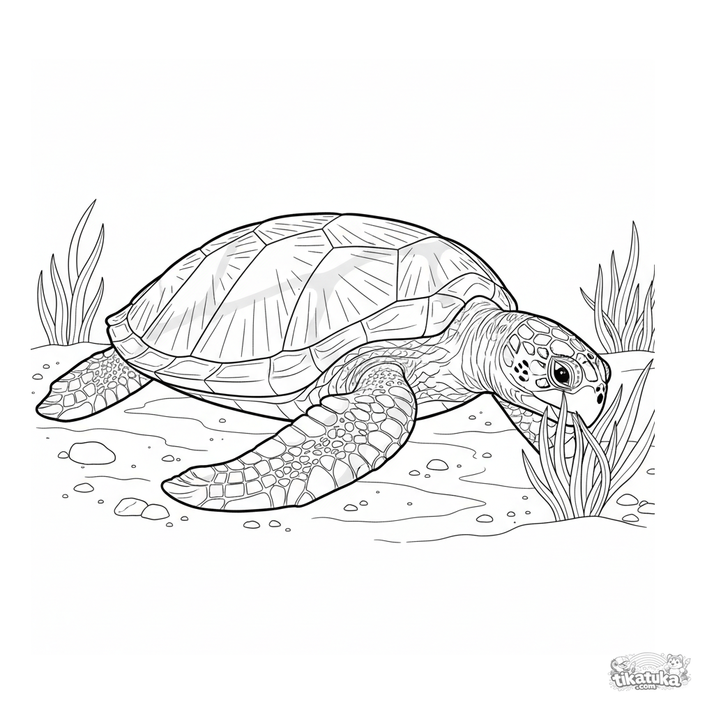 Complex realistic coloring page for older kids 10-12: a sea turtle grazing on seagrass in a sunlit lagoon. High detail on shell and environment.