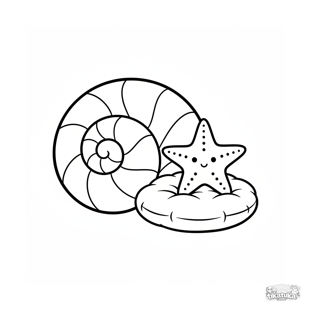 Simple realistic coloring page: a large spiral seashell and a smiling starfish rest on a soft pillow. Large shapes for children 2-3 years old.