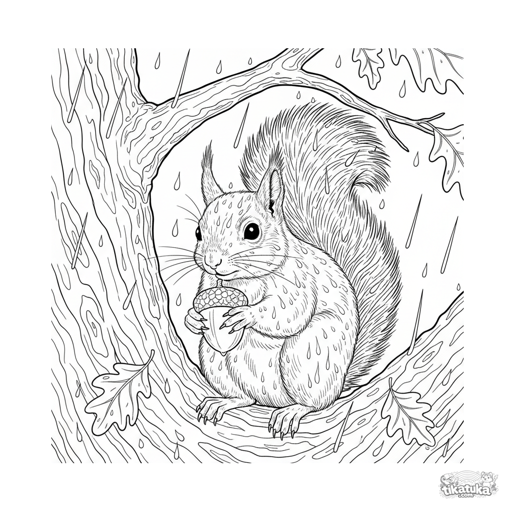 Detailed realistic coloring page for older kids 10-12 years: a squirrel with an acorn sits on an oak trunk in autumn rain. Intricate details of fur, bark, raindrops, and leaves.