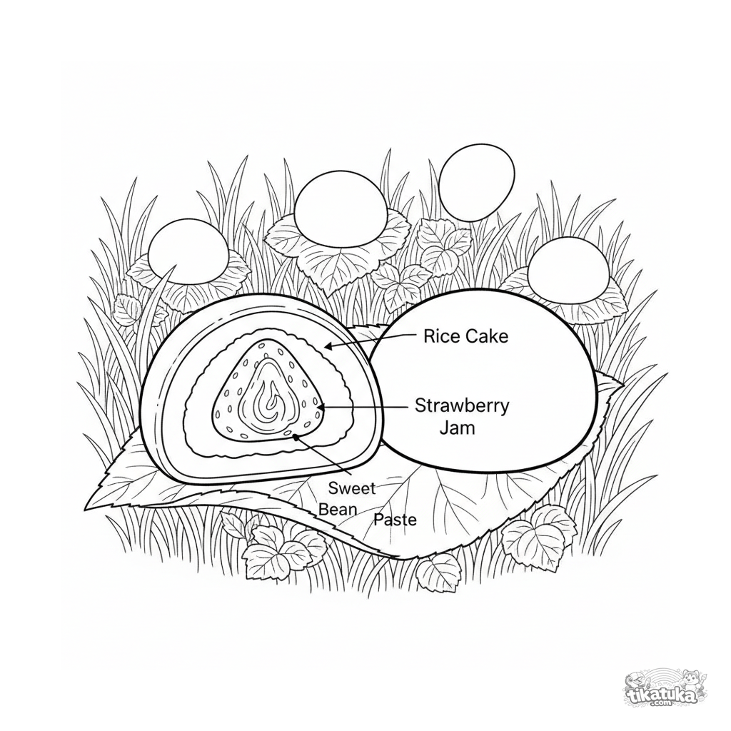 Realistic coloring page of a strawberry mochi cross-section. Educational sheet for older kids 10-12, showing the dessert's internal structure in a mochi field.