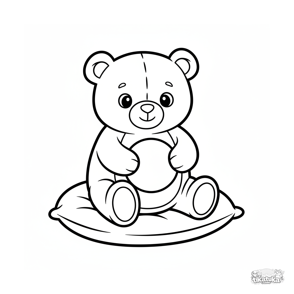 Realistic coloring page for toddlers: a teddy bear sits on a cushion, holding a smooth ball. Clear outlines and simple details for ages 2-3.