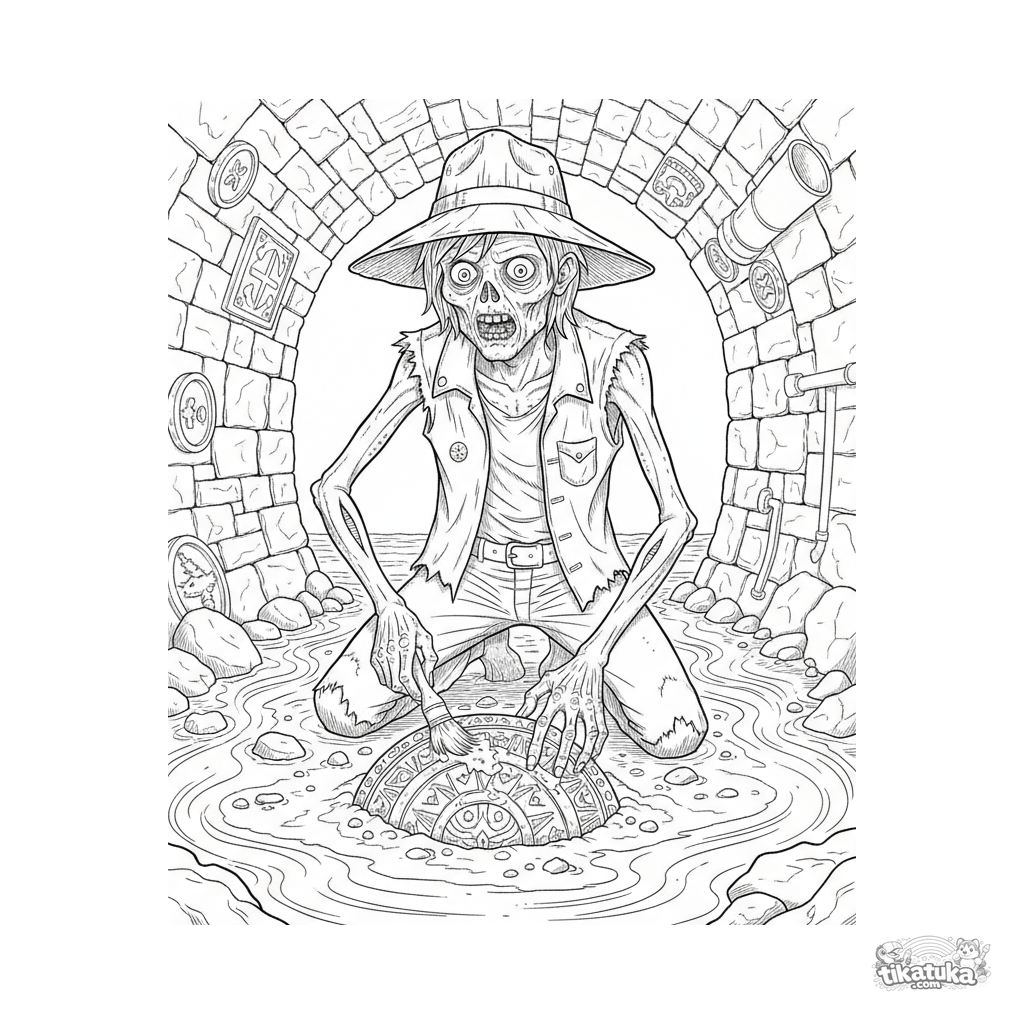 Complex coloring page for kids 10-12: a realistic zombie archaeologist discovering an artifact in a sewer channel. Vintage engraving style, many details.