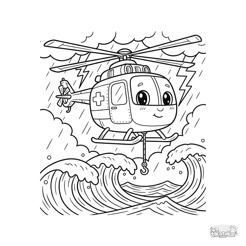 Coloring page of a rescue helicopter for kids 7-9. The helicopter hovers above raging waves during a thunderstorm, ready for a rescue mission. A dynamic action scene.