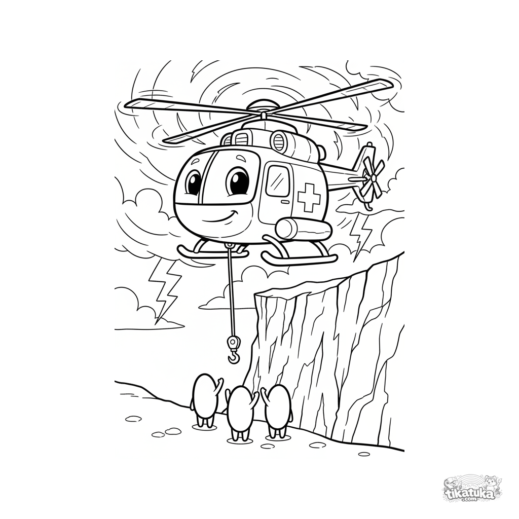 Coloring page for kids 7-9: a rescue helicopter with a red cross hovers near a rocky cliff during a storm with lightning in the sky, a winch cable dangling below.